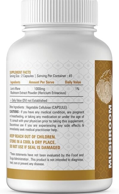 Lions Mane Supplement Capsules Mushroom Supplement – Lions Mane Powder 90 Capsules – Organic, Non-GMO, Gluten-Free – Brain Boost, Immune Support, Memory & Focus