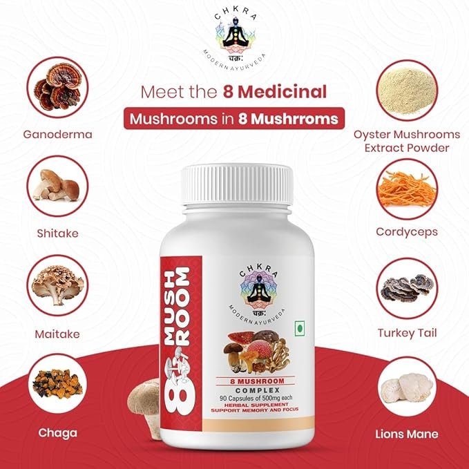 - POTENT BLEND Mushroom Supplement: This supplement contains 8 powerful mushroom extracts – Lions Mane, Turkey Tail, Cordyceps, Ganoderma(Reishi), Shiitake, Maitake, Chaga, and Oyster.